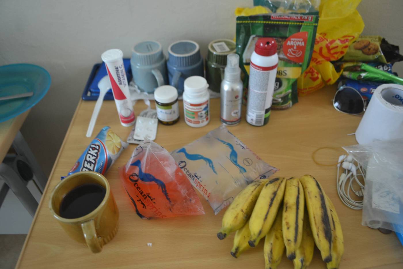 Ještě poslepu vezmu sáček vody a rozpustím si šumivku s vitamínem C. Ano, sáček vody. Sachet. Zapiju tím vitamín B a doxycyklin – profylaxi proti malárii. Doxycyklin není tak efektivní jako malaron, který bere většina lidí, ale byla to prostě trošku levnější varianta (1 euro vs. 200 eur)