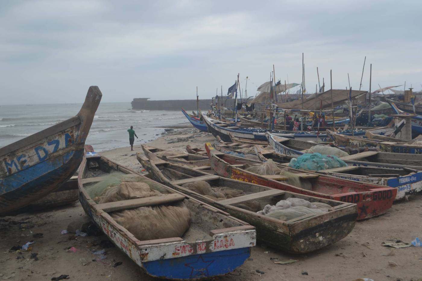 Nově příchozí britští studenti. Sotva dojeli, vyrazili s námi na výlet. Na mainstreet kupují kukuřici na cestu. Nemyslím, že byl uplně dobrý nápad jít hned první den na procházku do Jamestownu. V trotru ještě pěkně s úsměvem…Přicházíme do přístavu. Dítě si hraje s pneumatikou. Nebo možná že nehraje a někam ji táhne… Tak takhle si tady žijou. Ga people, původně farmáři, dnes rybáři, kteří se zde usadili ještě před vznikem Accry jako takové. Končí tady taky lidé, kterým se nepodaří nikde ve městě uchytit. A spousty sirotků… Buďto odjinud, nebo děti rybářů, kterým se jednoho dne na moři nepoštěstilo. Jeden z momentů, kdy jsem se fakt nenáviděla. S průvodcem vstupujeme do přístaviště. Myslím na tzv. poverty tourism – turistika za chudobou; mnohými rozebírané téma. Celé mi to přijde tak neetické, my, obroni (slangově lidé zpoza horizontu, běloši), se svými zahojenými životy a zrcadlovkama na krku si jdeme na procházku v ceně dvou piv sem. Očumovat lidi, kteří tady žijí a pracují. Fuj. Ale stejně mi to nedá a sem tam od pasu nějakou fotku střelím. Když už tam jsem. A byla jsem ráda, že jsem tam šla, nicméně…strašně moc jsem si přála neviditelný plášť.Pytle (s fakt nevim-čim) této velikosti nosívají nosívají místní běžně na hlavě. Je to skutečný skill. Na ulici jsme viděli i spontánní soutěže o to, kdo unese větší pytel 🙂 Nevím, proč to nošení věcí na hlavě neprovozujeme taky, přijde mi to dost praktické. A jo, my vlastně moc věcí nosit nepotřebujem, tak jsme na to nemuseli přijít…Lodě z jednoho kusu dřeva.Je-libo rybičku?Dítě před místní školou pro sirotky.